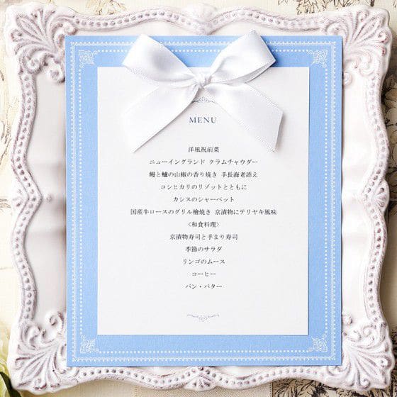 メニュー表 リュミエール サムシングブルーメニュー表の通販結婚式招待状・席次表の通販手作りも印刷もおしゃれで安いココサブ。