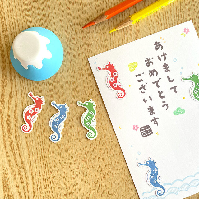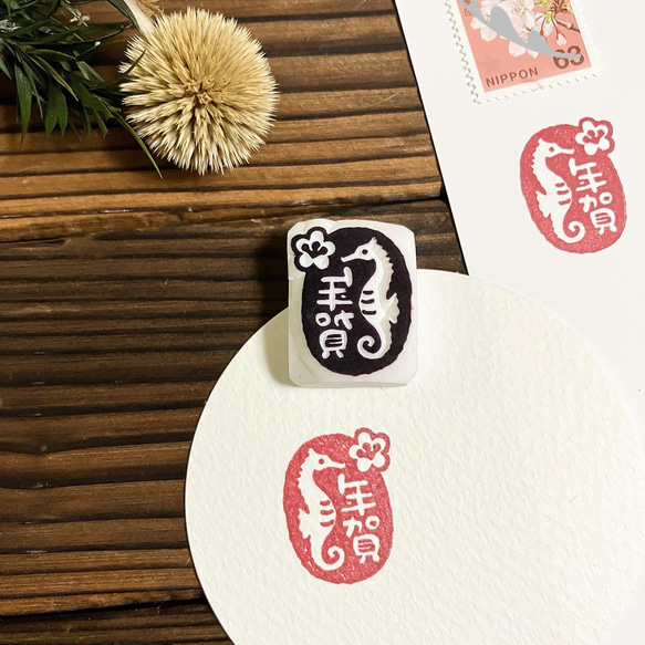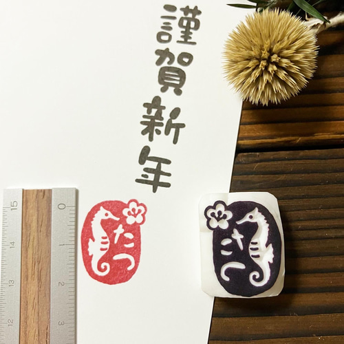 お正月2024 辰年 私製はがきの年賀状に*シンプル可愛い❤︎タツノオトシゴと 年賀 落款風はんこ 受注製作はんこ・スタンプnijiirostamp 通販 16627706Creema クリーマ。