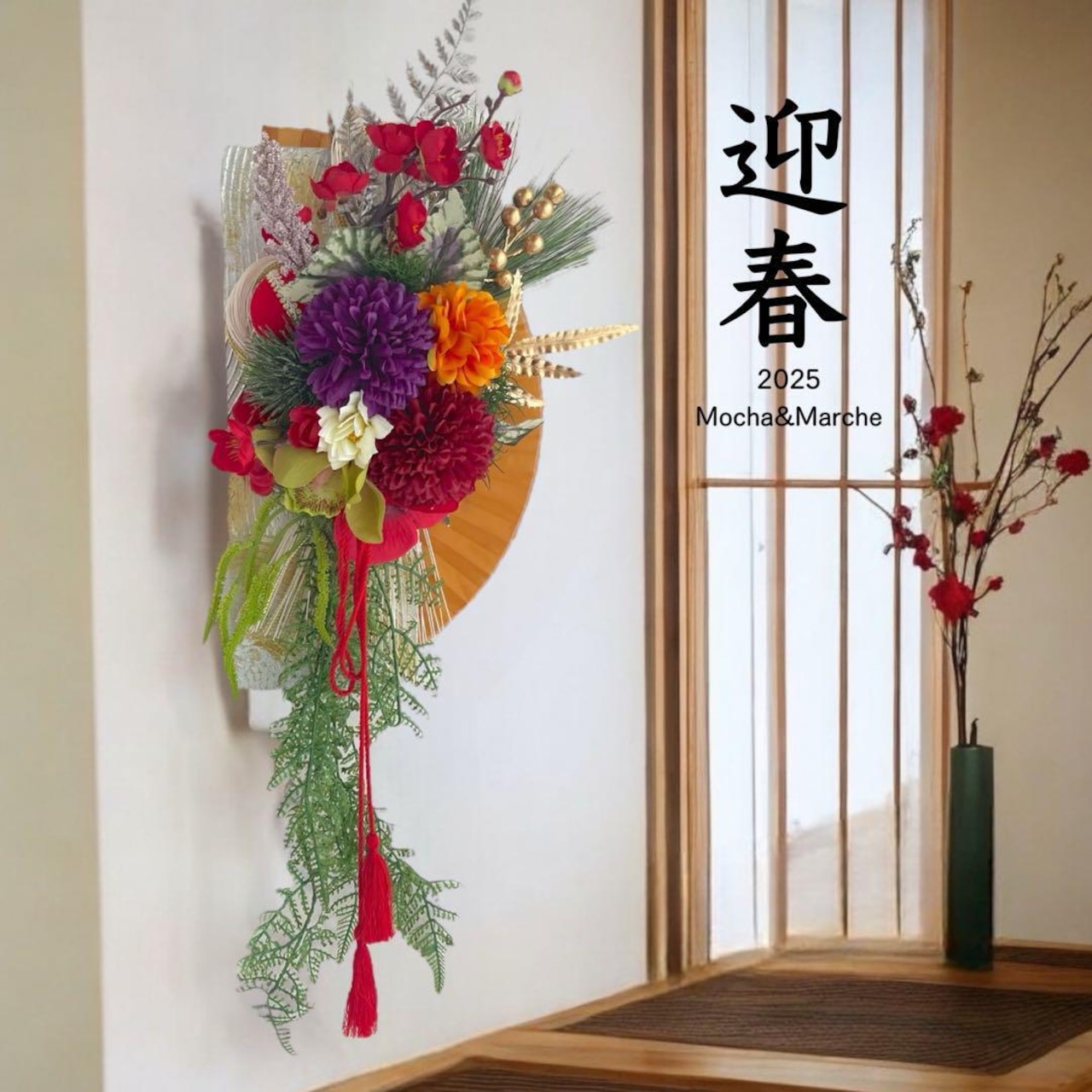 ひな祭りリース 和風リース ニットリース 毛糸玉リース 和風 和装婚 お正月100均造花。
