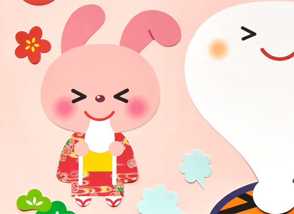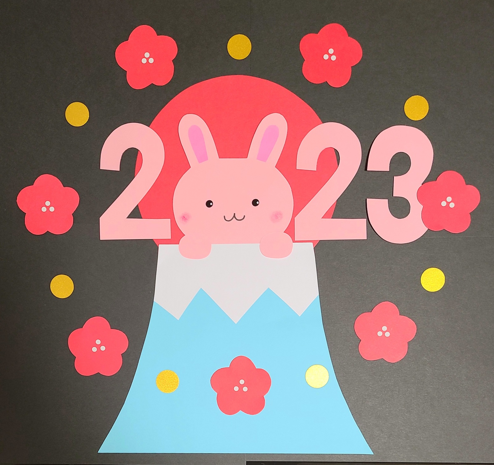 無料ダウンロード型紙で「干支 卯 女の子 お正月バージョン」の壁面飾りを作ってみた!保育園 幼稚園 介護施設 壁面装飾 製作 春 冬 うさぎ 1月壁面飾り型紙工房。