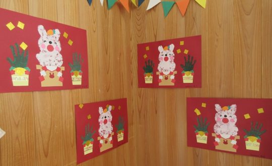 あけの保育園 お正月の壁面飾り 3歳児・うさぎ組。