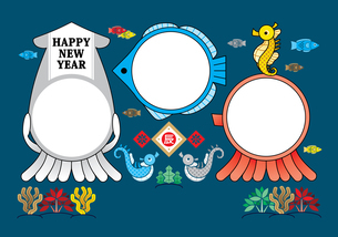 辰年イラスト年賀状デザインカラフル魚タツノオトシゴフレームのイラスト素材FYI07863744。