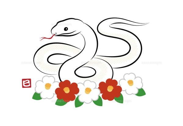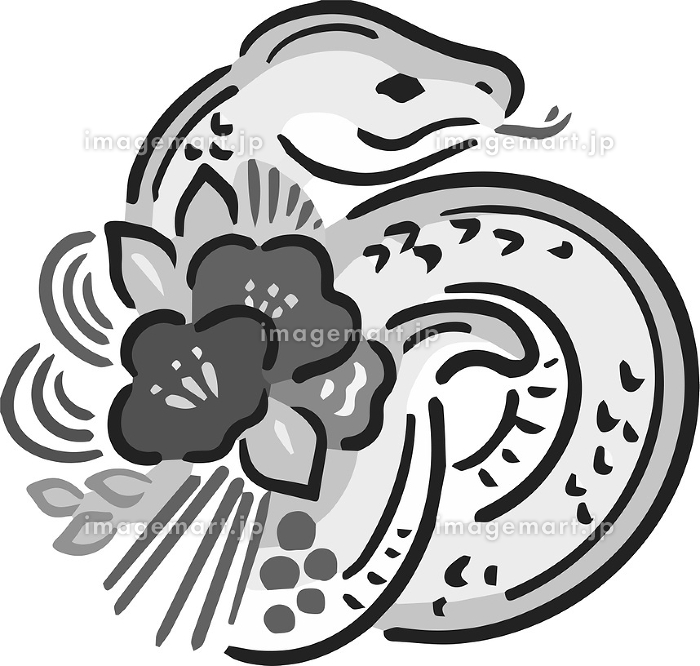 椿の花と八の字にとぐろを巻いている縁起の良い蛇のイラスト 墨絵風でお洒落な巳年の年賀状素材のイラスト素材FYI08124365ストックフォトの Qlean Market キュリンマーケット。