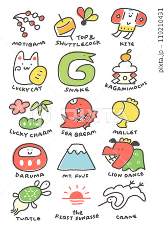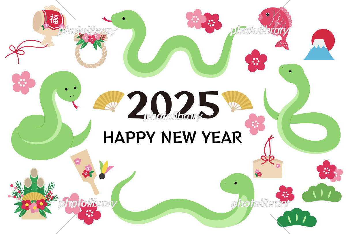 蛇と正月の縁起物の可愛いイラスト 年賀状素材 2025 英字 手描き 線画のイラスト素材119210617- PIXTA。
