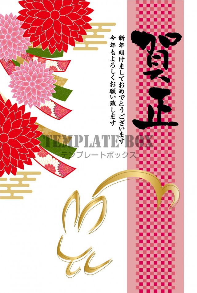 2023年の卯年年賀状素材:縦型 豪華な和柄の花模様とうさぎのイラストがおしゃれな年賀状テンプレート無料の年賀状素材TemplateBox。