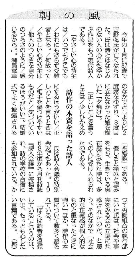 祝婚歌」で有名な詩人、吉野弘さんがご逝去されました。: 加藤恕 ひろし のバードビュー bird's eye view。
