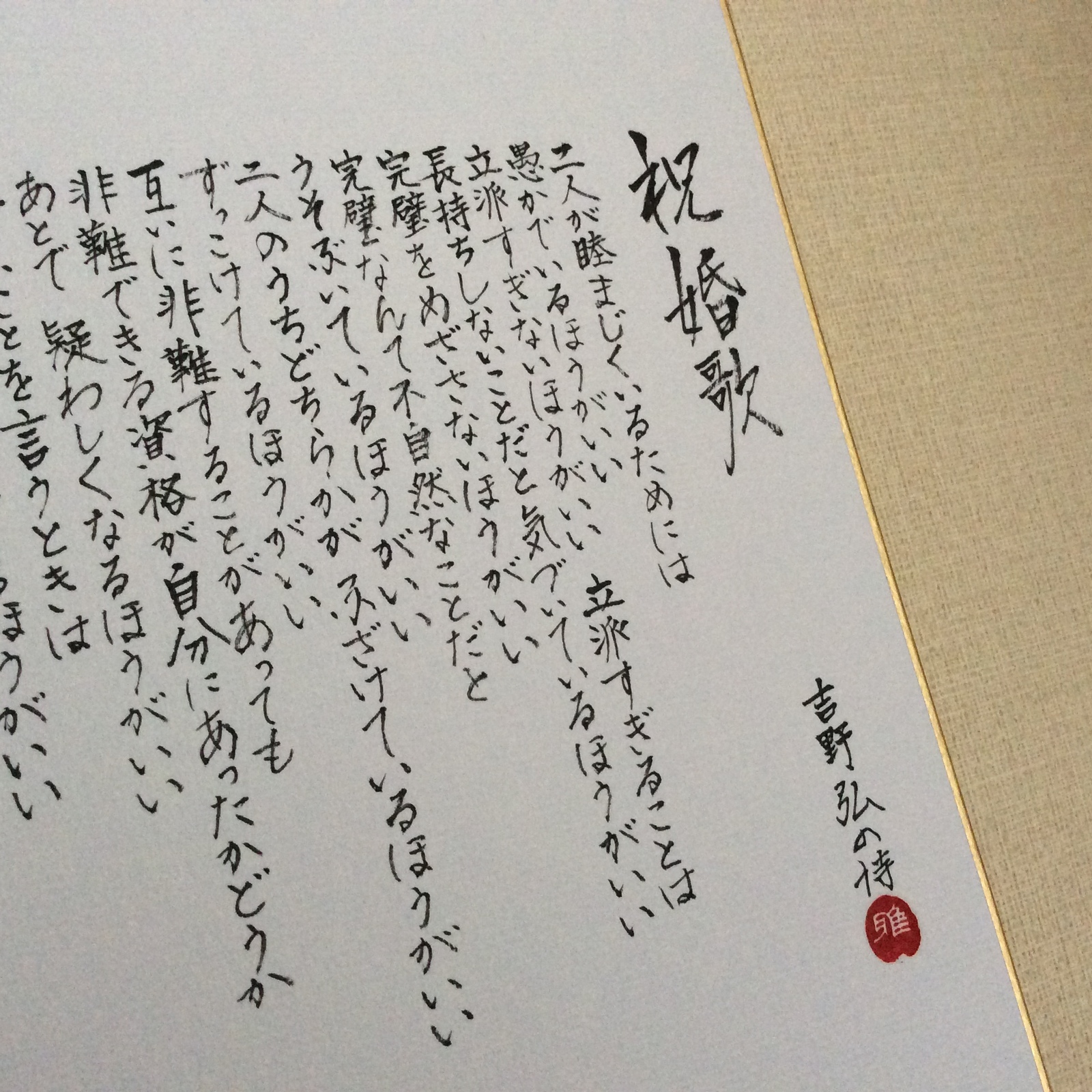 U様に納品させていただきました☺️💖 ご結婚された息子さんご夫婦への💝プレゼント☺️💕 ご結婚おめでとうございます☺️💖 詩人・吉野 弘さんの 祝婚歌とても✨素敵な詩✨です。 φ描きながら本当にそうだな~と心にしみてくる歌でした。結婚祝い吉野弘。