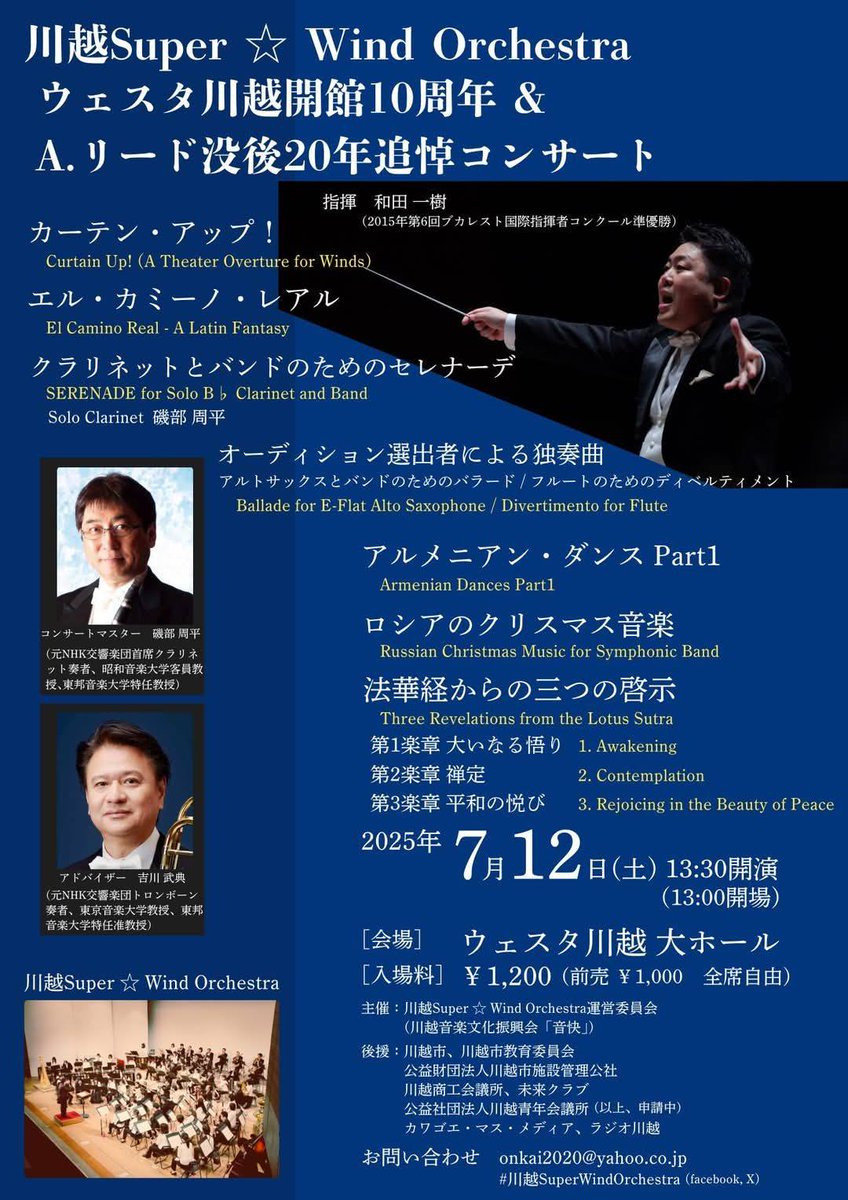 小江戸川越STYLE on X: "今度の土曜日に開催されるのが、「ウェスタ川越開館10周年記念&A.リード没後20年追悼コンサート」。このコンサートは、ウェスタ川越開館10周年を記念し、吹奏楽の巨匠アルフレッド・リードの没後20年を追悼して、公募による吹奏楽団がリード作品。