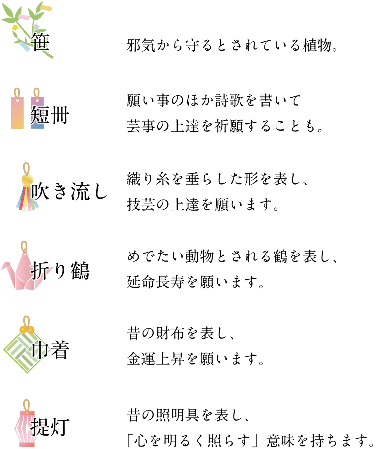 七夕の意味・由来 – 七夕飾りの意味 一覧表。