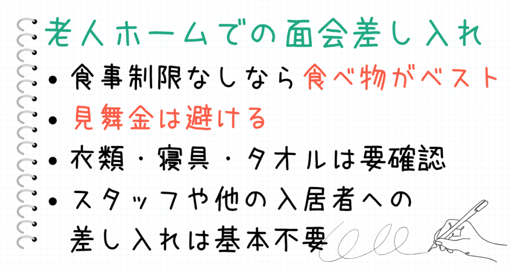 老人ホームや介護施設へのお見舞い 面会の基礎知識〜面会ルール、お見舞い 差し入れの品物、見舞金、職員への差し入れ、お返し、体験談これからの。