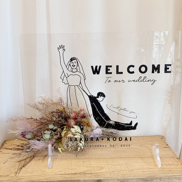 新婦に引っ張られる新郎がユニークなオリジナルウェルカムボード │ウェディング 結婚式 ウェルカムボード DIYstorePBW 通販8917395Creema クリーマ。