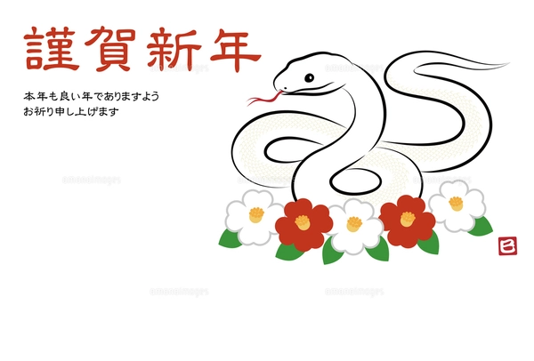 ツバキのお花と八の字にとぐろを巻いている縁起の良い蛇のイラスト 墨絵風でお洒落な巳年の年賀はがき テンプレートのイラスト素材FYI08165109ストックフォトの Qlean Market キュリンマーケット。