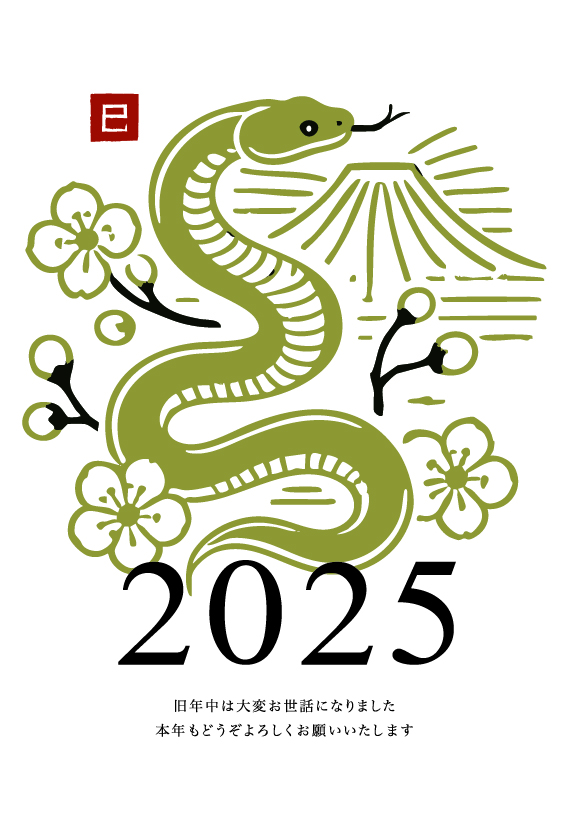 2025年の干支「巳」の年賀状イラスト 縁起の良い蛇と富士山 – 無料ダウンロードイラストダウンロード。
