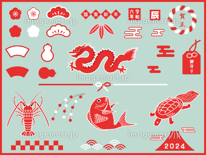 めでたい縁起物の紅白の2024年 令和六年 お正月、年賀状素材セット ベクターイラストのアイコン、フ227531964- イメージマート。